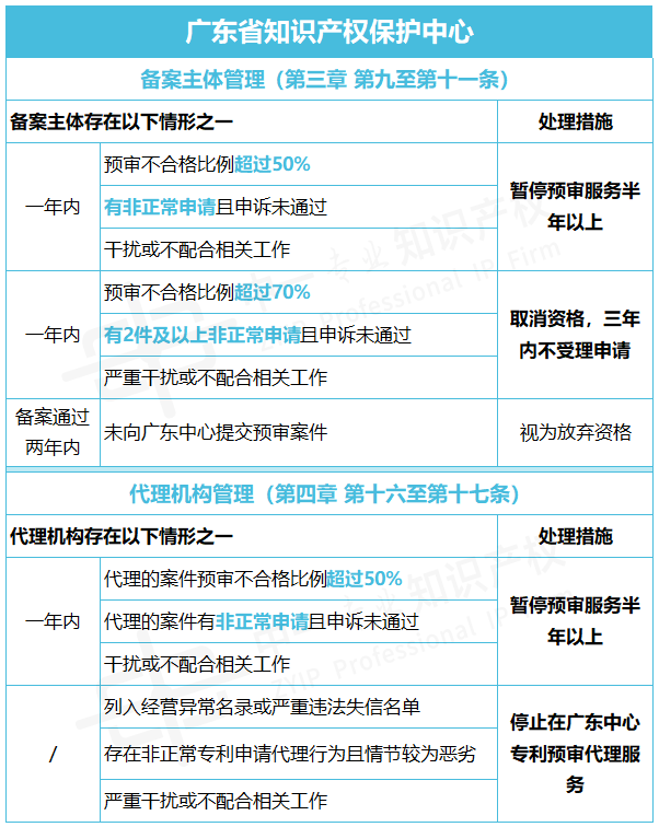 為進壹步提高專利申請預審服務效能,更好地發揮專利預審服務支持產業創新發展的積極作用,近日,廣東省知識產權保護中心、浙江省知識產權保護中心分別印發了《廣東省知識產權保護中心專利申請預審備案主體、代理機構管理辦法》《浙江省知識產權保護中心備案主體、代理機構預審服務管理辦法》,其中均提到: