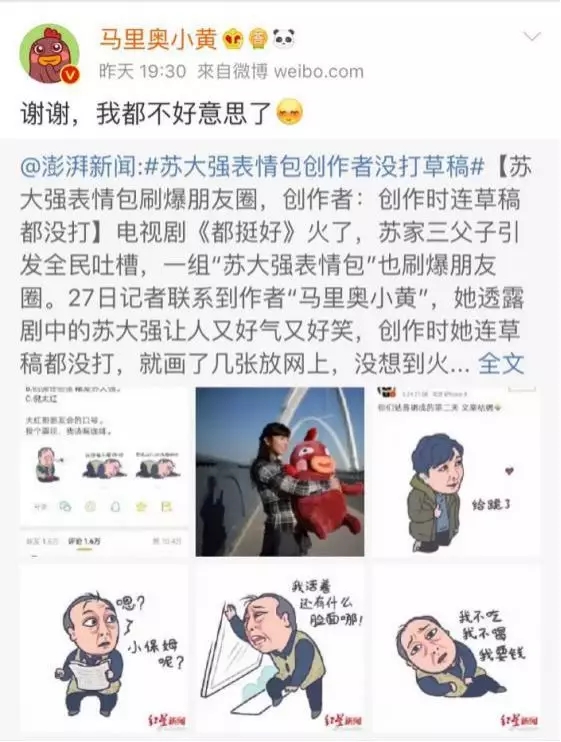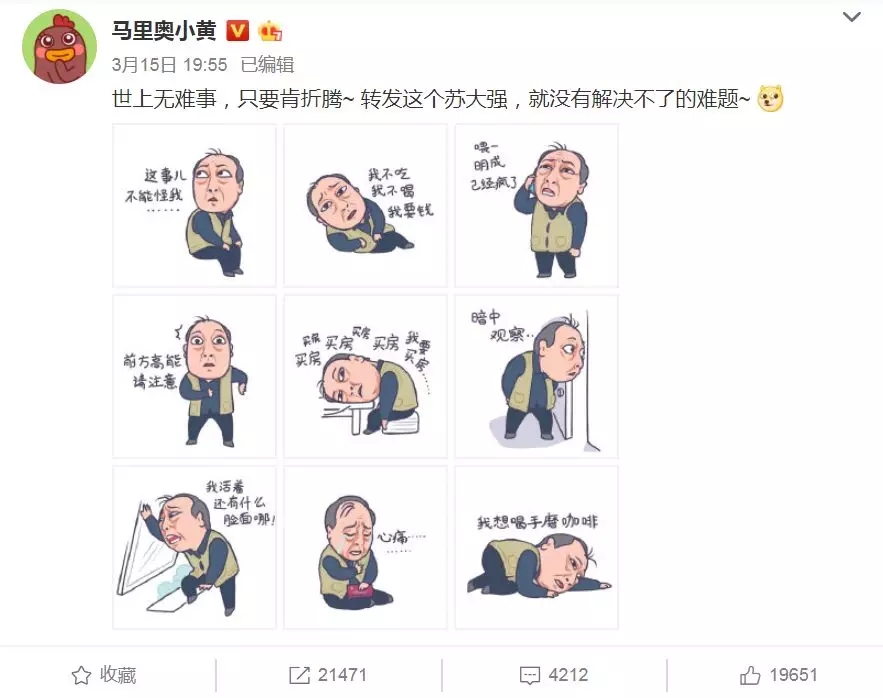 “转发这个苏大强,就没有解决不了的难题”?!怕是“入坑”不自知。电视剧《都挺好》热播,“苏大强”站据流量C位,粉丝对爱豆或热门影片的追捧,奇招层出创意百态,网友马里奥小黄就做出了,苏大强的同款Q版表情包,在网络大火并被各行各业二次加工变换文案转发。