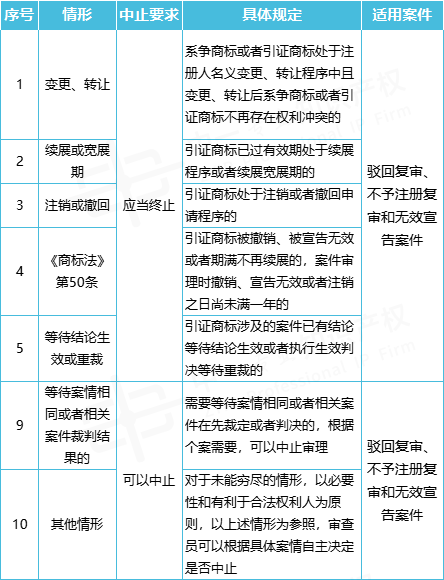 一、规范中规定适用中止审理的评审案件主要有:驳回复审、不予注册复审、无效宣告。有10种中止情况,参考附图。