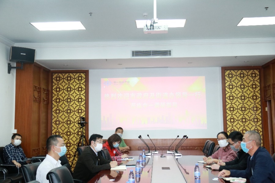 3月16日,福田区副区长朱伟华率华强北街道党工委书记陈晓中、通心岭社区工作站书记、站长张丽芬等领导一行莅临中一知识产权调研,检查指导企业疫情防控和复工复产工作。中一知识产权董事长张全文、总经办总监龚立、项目事业部经理葛泽龙陪同调研,参与调研座谈。