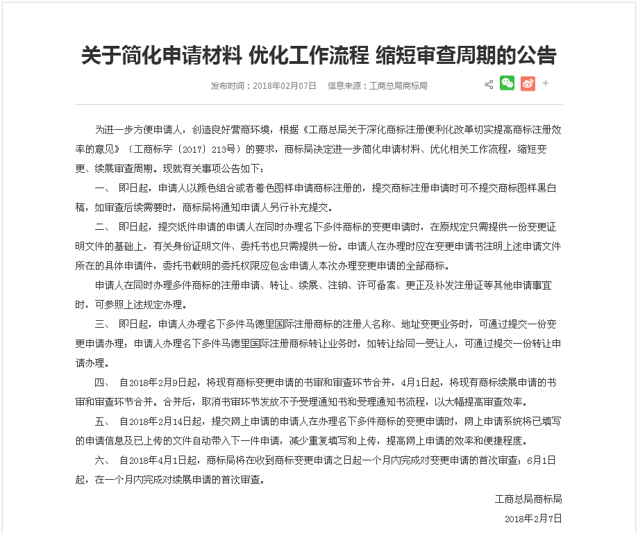 为进一步方便申请人,创造良好营商环境,根据《工商总局关于深化商标注册便利化改革切实提高商标注册效率的意见》(工商标字〔2017〕213号)的要求,商标局决定进一步简化申请材料、优化相关工作流程,缩短变更、续展审查周期。现就有关事项公告如下:
