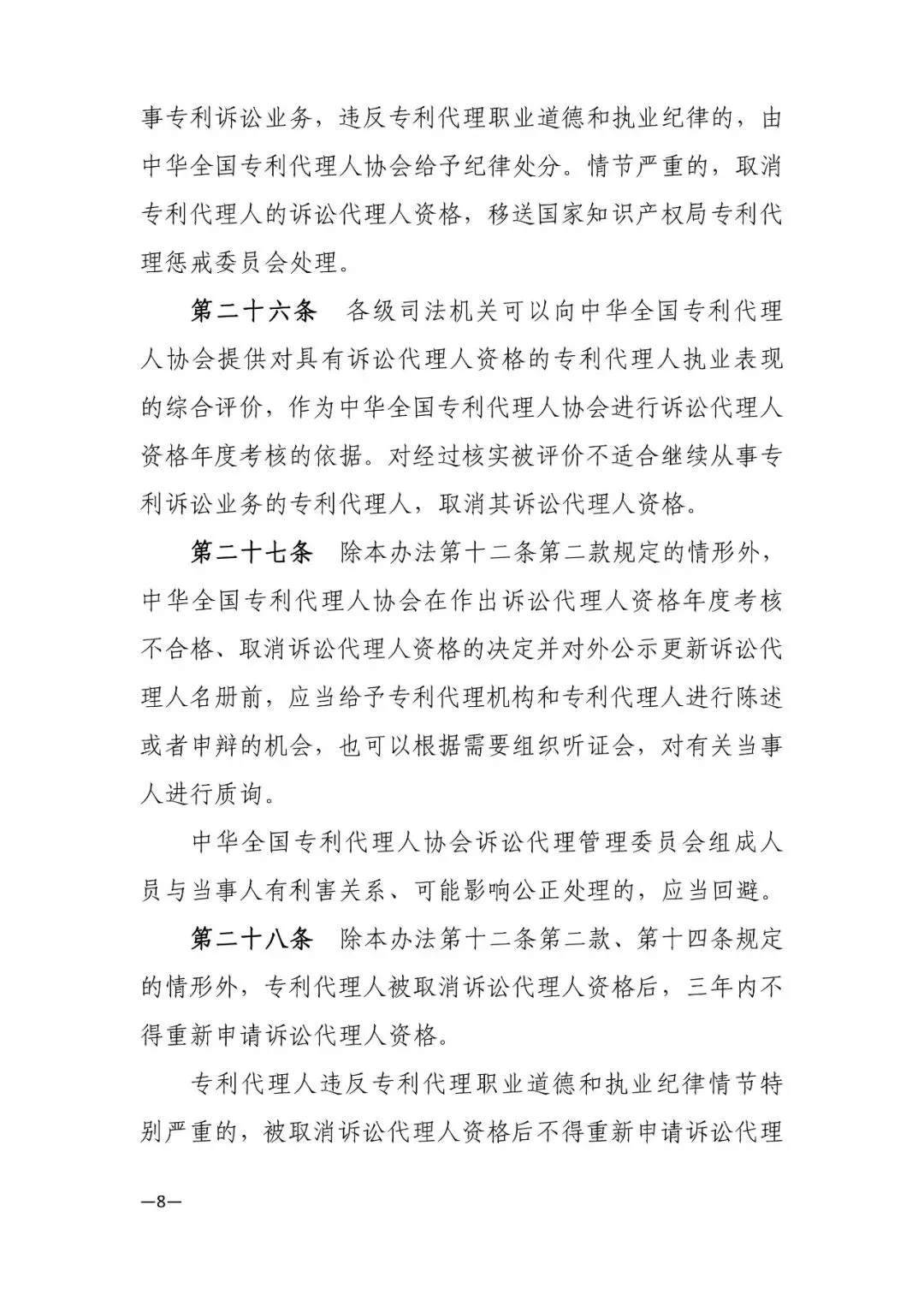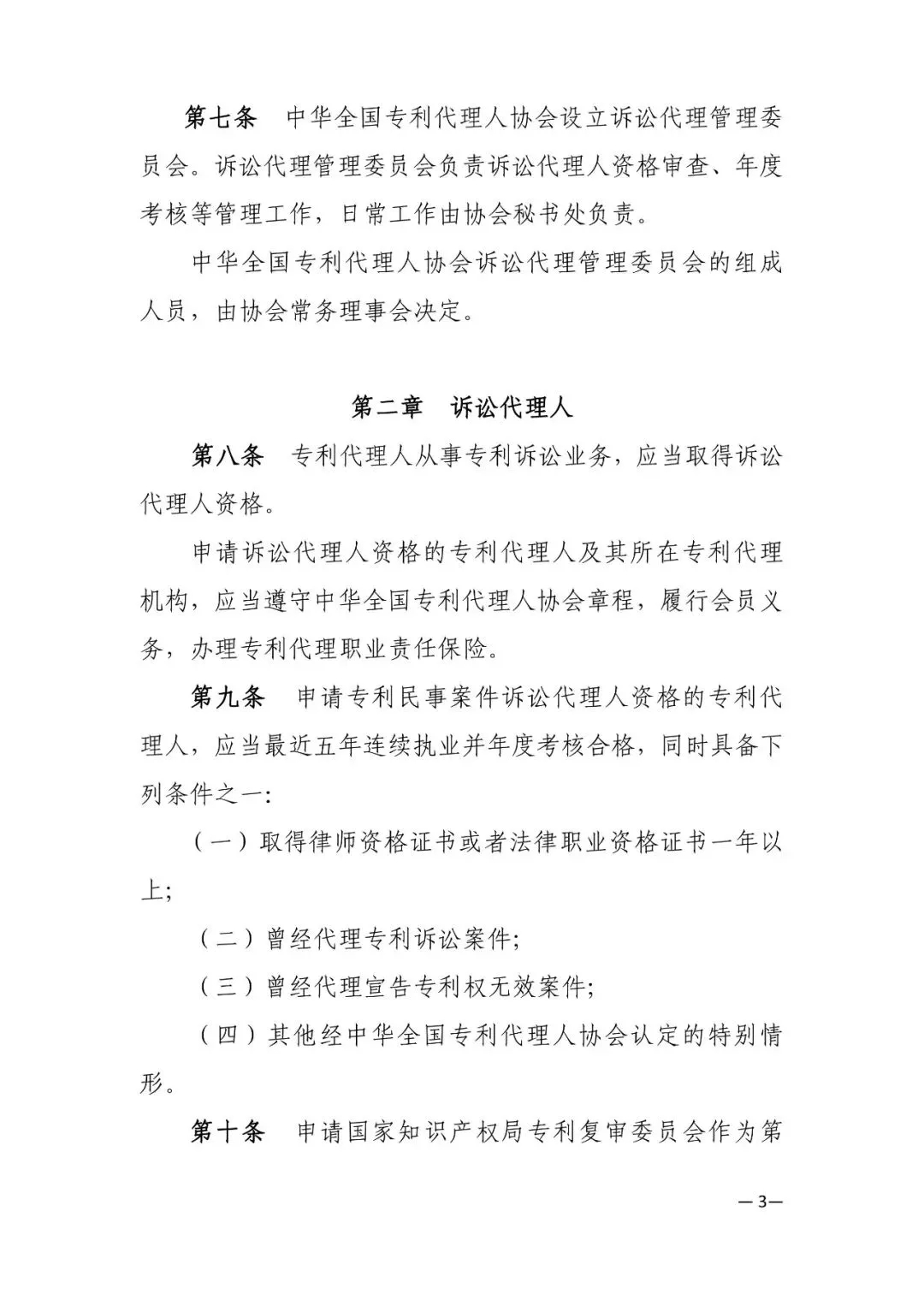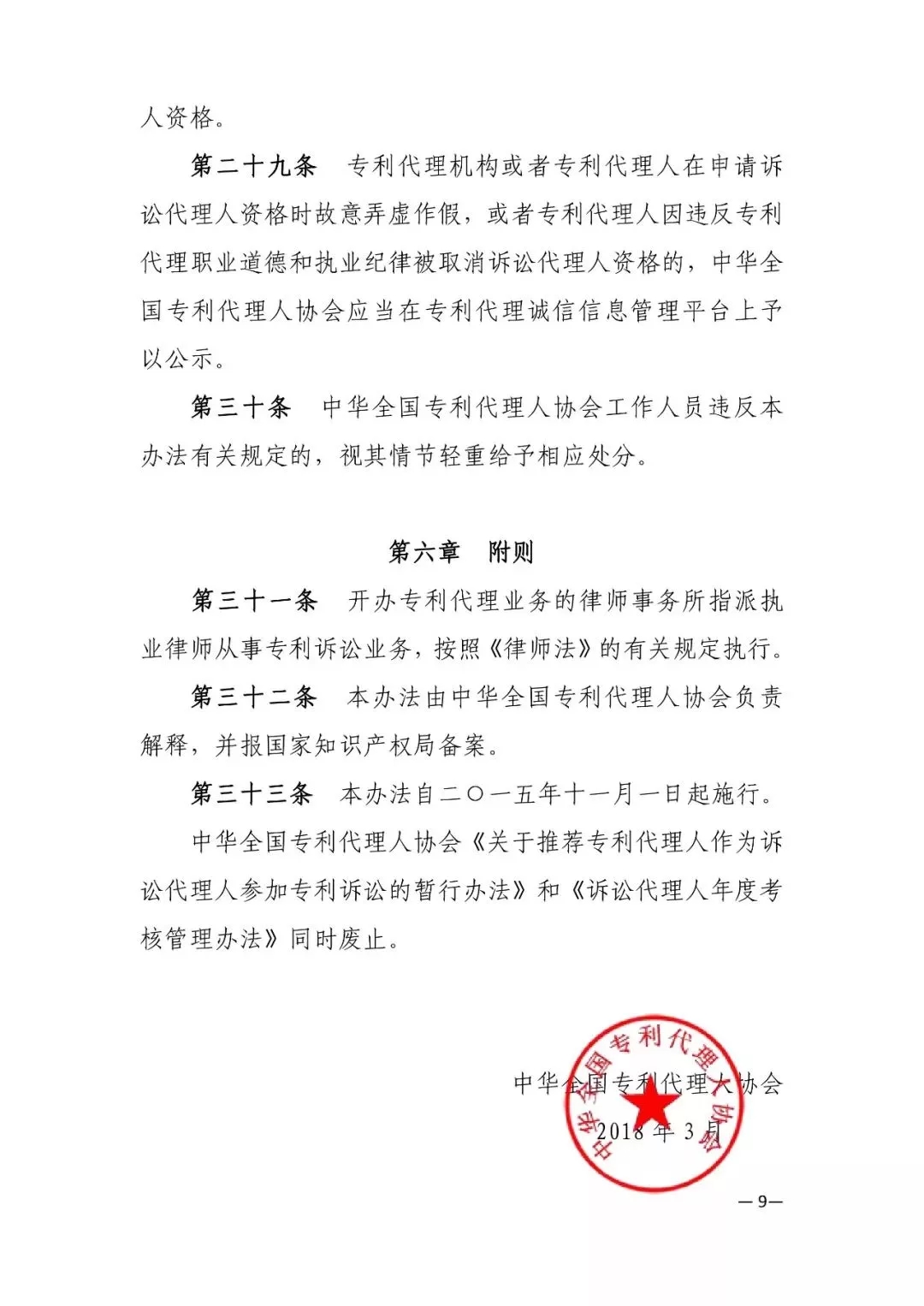 为了更好地进行诉讼代理人推荐及管理工作,中华全国专利代理人协会于2018年1月22日启动了对《中华全国专利代理人协会诉讼代理管理办法》(全专协发字〔2015〕10号)的修订工作。新修订的《中华全国专利代理人协会诉讼代理管理办法》(全专协发字〔2018〕004号)经中华全国专利代理人协会常务理事会表决通过,现予以发布,并自发布之日起施行。