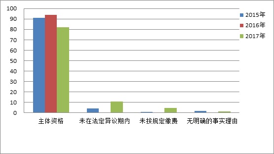 自2014年新法实施以来,“主体资格不符合《商标法》第33条规定”一直是行政争议的核心焦点,因主体资格问题引发行政争议的比率一直偏高,该条原因在引起行政复议原因中所占比率也远远高于其他(见下图)。2017年,该比率首次下降至90%以下,各类行政复议案件数量自新法实施以来首次呈现下降趋势(2015年196件,2016年223件,2017年156件),前期理论研讨工作初见成效。但仍有部分异议人和代理机构对新法规定理解始终不够准确。